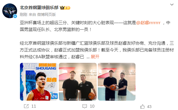 北京男篮官方公告写道:“亚洲杯赛场上的超远三分、关键时刻的大心脏表现——这就是赵睿,中国男篮现任队长、北京男篮新的一员!”