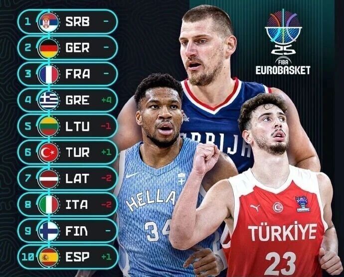 今年欧锦赛实力榜,塞尔维亚高居榜首,希腊位列第四,斯洛文尼亚则无缘前十。