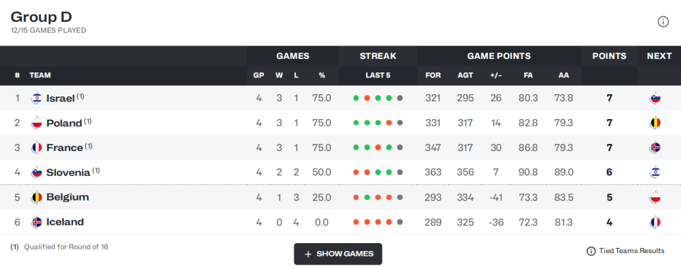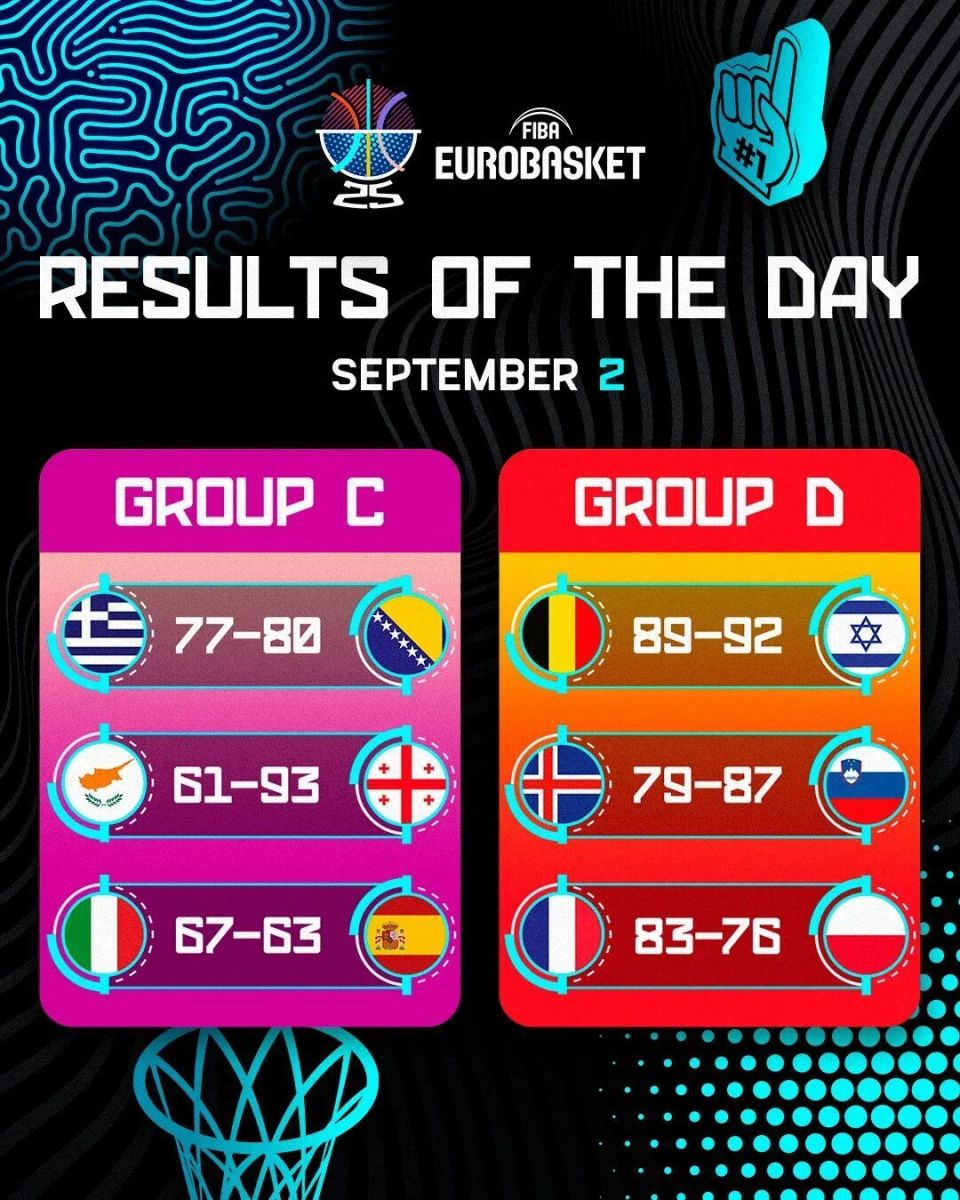 北京时间9月3日,男篮欧洲杯小组赛:字母哥因膝伤缺阵,希腊77-80不敌波黑;比利时89-92输给以色列;格鲁吉亚93-61大胜塞浦路斯;斯洛文尼亚87-79击败冰岛;意大利67-63险胜西班牙;法国83-76力克波兰。