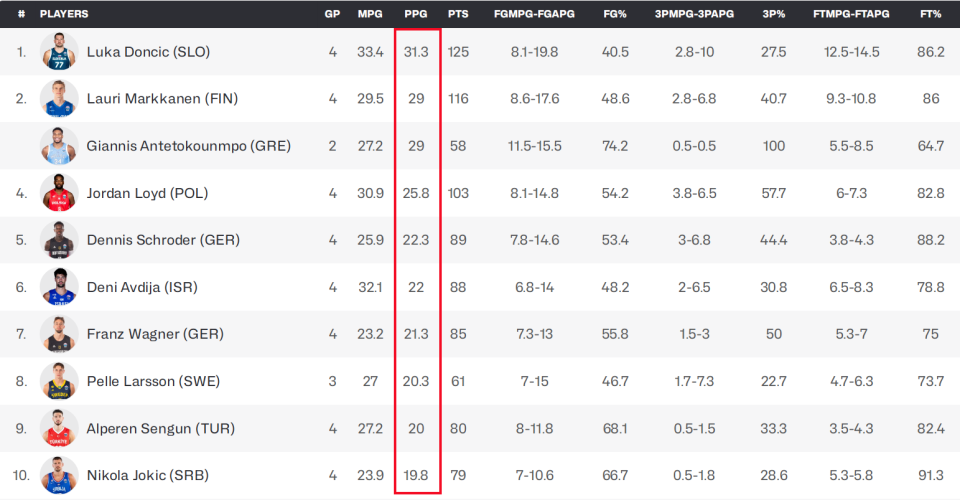 健康的字母哥,依然是FIBA大杀器。本届欧洲杯,他场均出战27.2分钟,得到29分7.5篮板3助攻1.5抢断3失误,三项命中率:74.2%,100%,64.7%。场均得分和马尔卡宁持平,并列欧洲杯第二,仅次于东契奇(场均31.3分)。