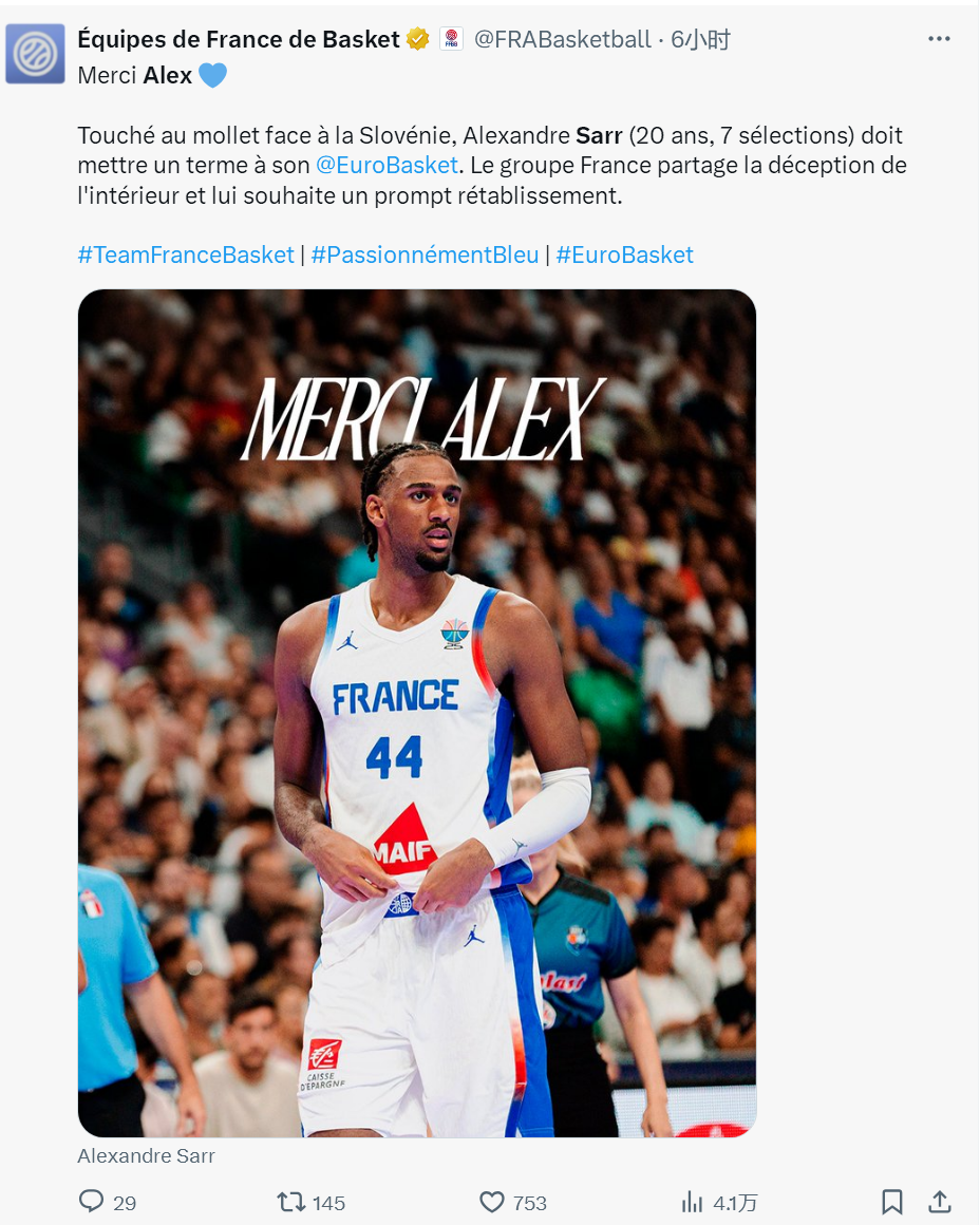 法国男篮再遭打击:NBA榜眼亚历克斯-萨尔小腿受伤,本届欧洲杯报销。由于文班亚马和戈贝尔都不打,法国内线本来就缺人,如今法国在中锋位置仅剩贾伊泰一人。NBA状元里萨谢替补出战15分22秒,4投0中仅得0分4篮板3助攻。