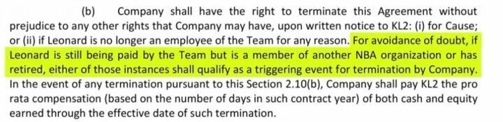 据资料显示,伦纳德与Aspiration公司签下了一笔价值2800万美元的代言合同,然而这实际上是一个根本不存在的挂名职位,并且这家公司获得了鲍尔默5000万美元的资金支持......协议中规定,伦纳德必须一直留在快船才能拿走全部的2800万美元,如果换队或退役合同就会提前终止。
