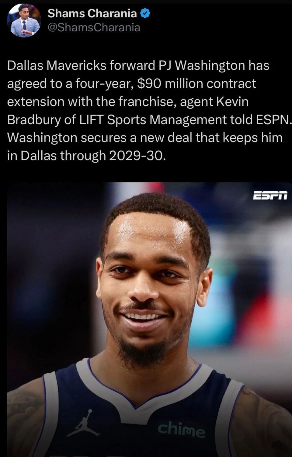 爆料王Shams:PJ-华盛顿四年9000万美元续约独行侠。