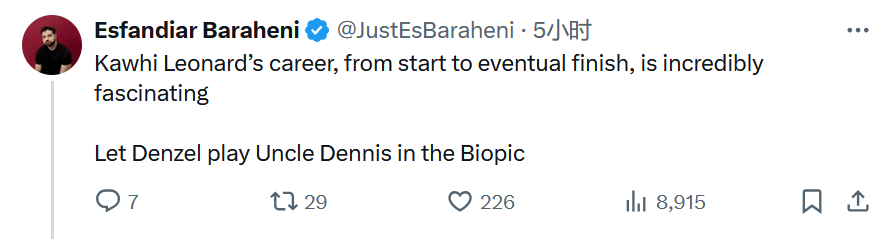 著名记者Esfandiar Baraheni更新动态并嘲讽道:“莱昂纳德的职业生涯——从伊始到终章——堪称一部跌宕起伏的史诗巨作。快(拍部电影)让丹泽尔-华盛顿来饰演传记他的丹尼斯舅舅!”