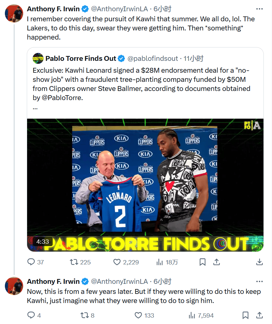 湖人记者Anthony F. Irwin转发该新闻并配文:“我记得那个夏天报道过湖人追逐莱昂纳德的过程。我们大家都记得,哈哈。湖人直到今天都坚称自己当时会拿下他。然后,发生了一些事情。”