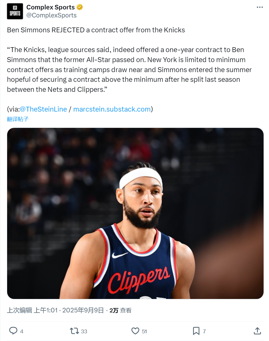 北京时间9月9日,据NBA名记Marc Stein报道,本-西蒙斯正式拒绝了尼克斯的一年底薪,他宁可无球可打,也不想签底薪合同。受薪金空间所限,现阶段尼克斯只能提供底薪。西蒙斯仍然坚信,自己能拿到超过底薪的合同。