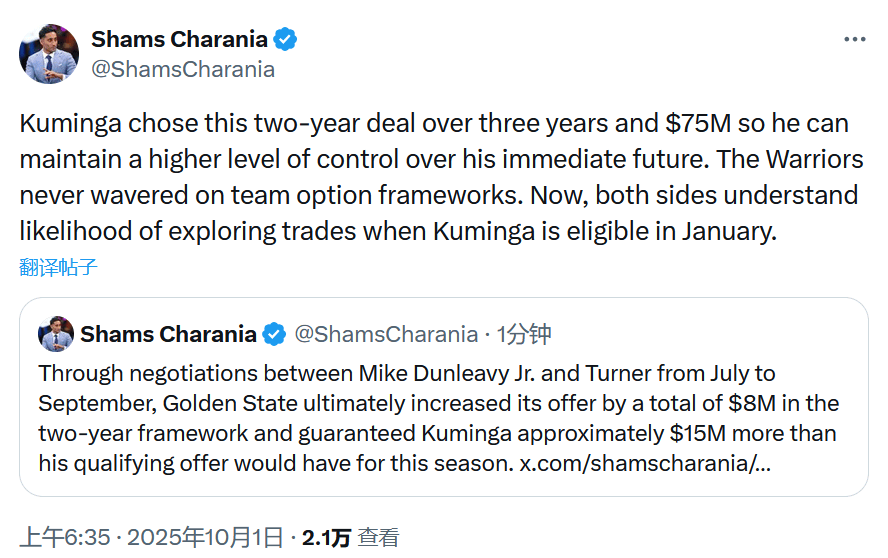 Shams在文中指出,库明加的经纪人亚伦-特纳告诉ESPN,库明加和勇士队结束了长达一个夏天的僵局,他同意一份为期两年、价值4850万美元的合同重返勇士队。这份合同包含球队选项,球队可以在明年夏天撕毁合同并重新谈判。