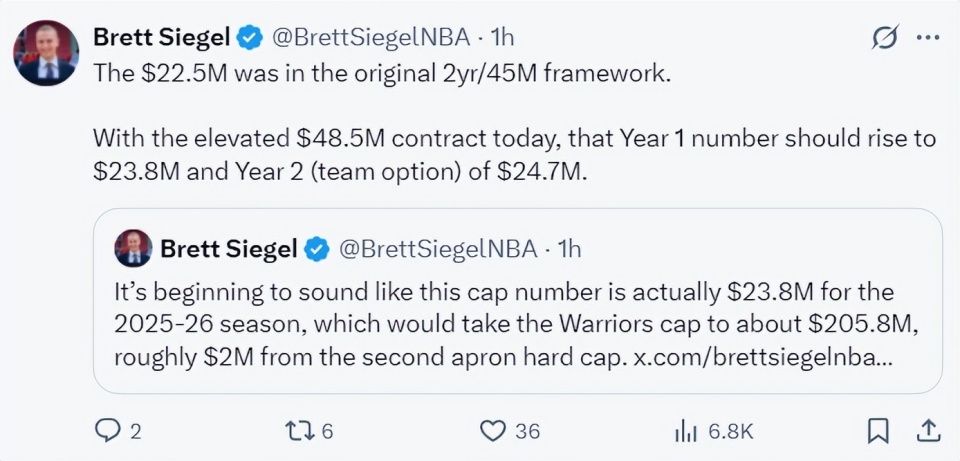 霍福德跟勇士队签下的是一份两年1200万的合同,第二年为球员选项,霍福德的合同细节,25-26赛季570万(全额中产特例),第二年为630万。