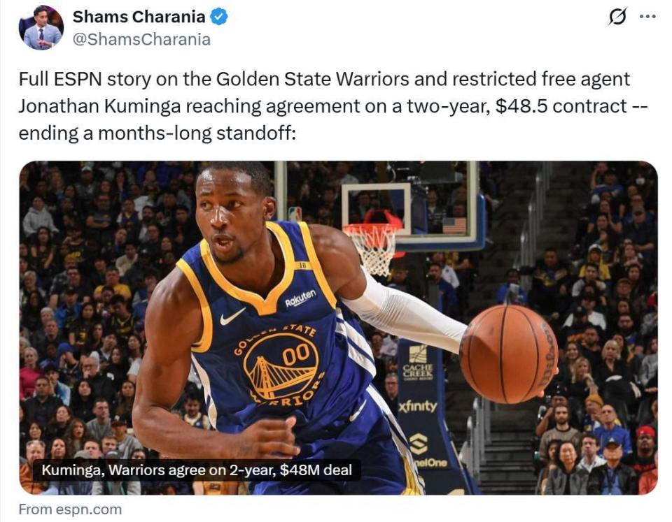 根据ESPN名记Shams报道,经过整个休赛期的拉扯,勇士队终于与库明加完成续约。
