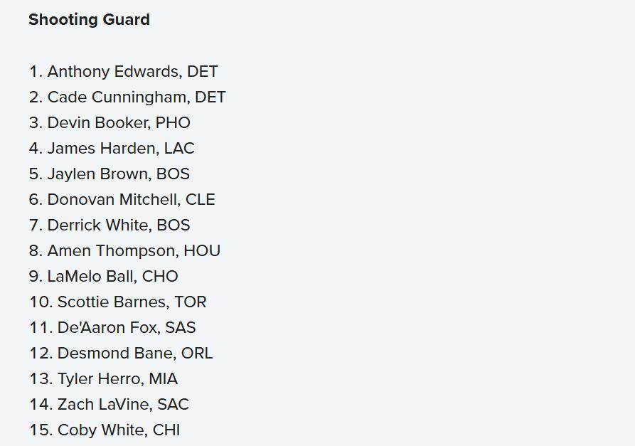 1-5名:亚历山大、东契奇、坎宁安、特雷杨、布克