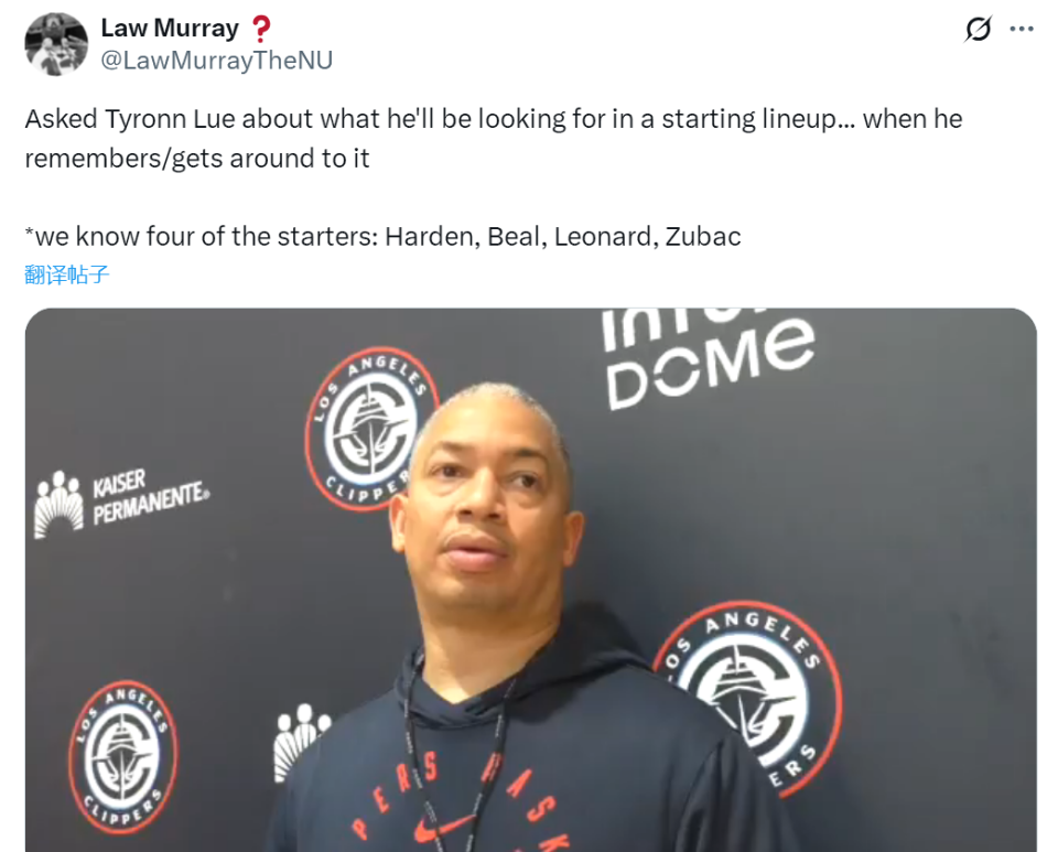 快船训练营开启,泰伦卢接受采访时谈到新赛季首发:“目前只有哈登、比尔、伦纳德和祖巴茨确认首发!”记者问,约翰-科林斯会不会打首发4号位?泰伦卢回答说不确定,得考察科林斯能不能从1号位防到4号位。这让快船球迷不禁担心起来。