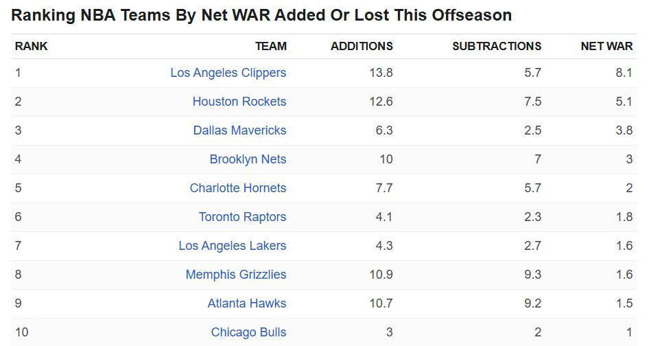 高阶WAR数据也直观显示火箭队在引援阵容调整方面高居联盟第一,无奈的是,范乔丹在训练营开启前重伤,而他的WAR值高达6.3导致火箭队遗憾无缘榜首。