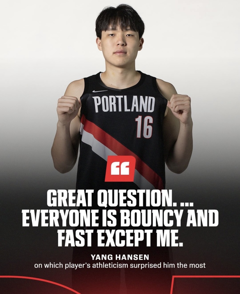 在此前训练营的一次采访之中,杨瀚森被问到开拓者训练营队内谁的天赋最好,有没有谁的运动能力或表现让他感到印象深刻。杨瀚森回复:“这个问题问得好啊,好像除了我以外都能跑能跳的”。