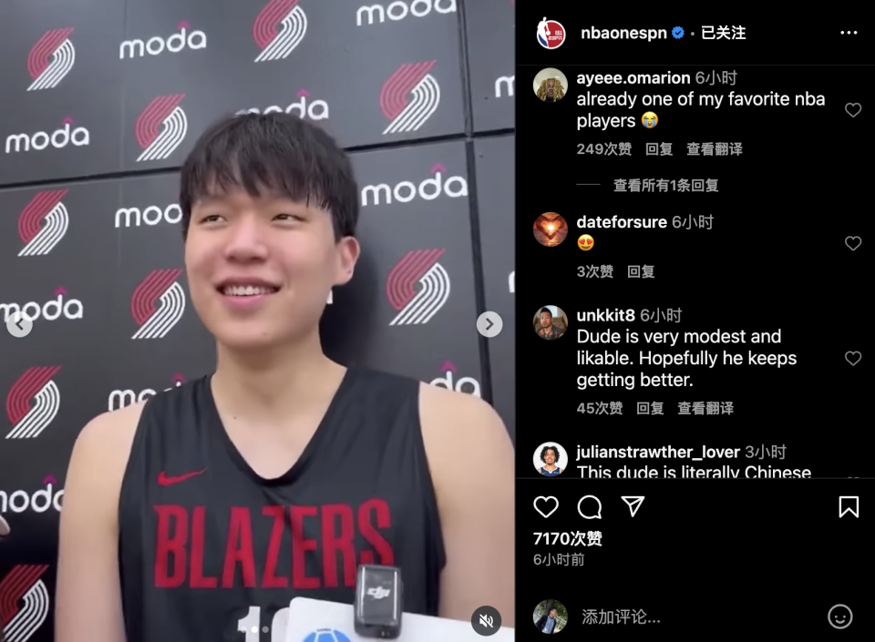 目前知名美媒ESPN和Bleacher Report都已转载了杨瀚森的这一段采访内容,ESPN更是配上了杨瀚森在夏季联赛的暴扣视频,证明他的回复属实是高情商回应。