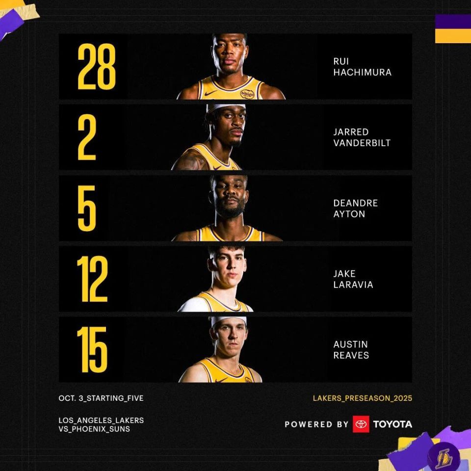北京时间10月4日,NBA季前赛,湖人vs太阳。湖人5名球员缺阵,太阳这边杰伦-格林不打。湖人首发:里夫斯、拉拉维亚、八村垒、范德彪、艾顿。太阳首发:布克、阿伦、狄龙、瑞安-邓恩、伊戈达罗。