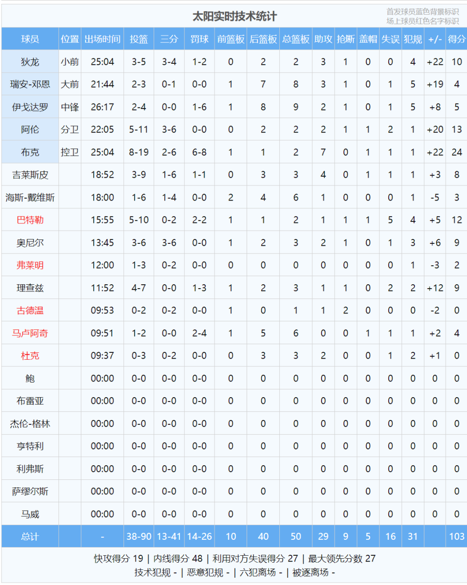 第四节双方派上替补,太阳10号秀卡曼-马卢阿奇登场亮相,进攻端出手机会不多。湖人替补后卫RJ-戴维斯连续砍分,他只是Exhibit-10合同。全场结束,太阳103-81大胜湖人22分,太阳内线得分48比22完爆湖人,助攻29比10!