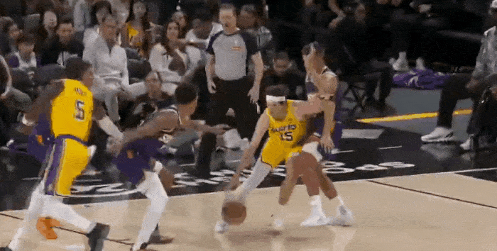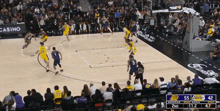 没有了里夫斯,湖人场上失去了唯一的进攻发起点,其余人基本都不具备支配球能力。
