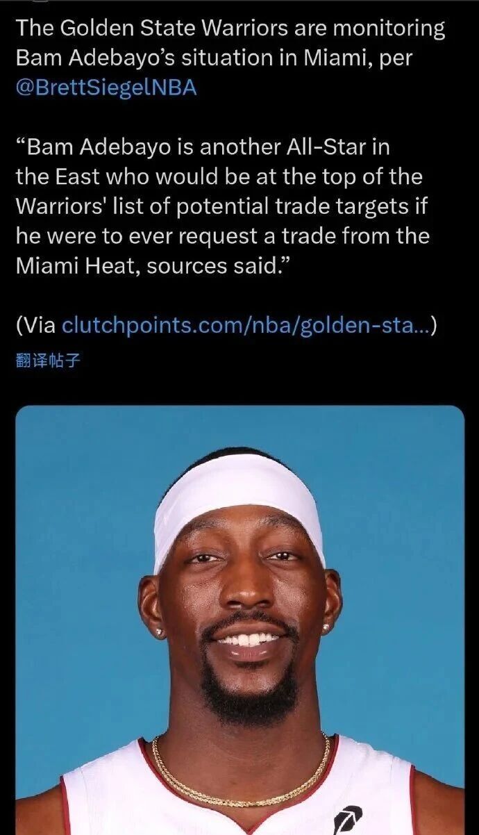 名记Siegel:倘若有一天阿德巴约跟热火申请提桶跑路,他就会是勇士交易目标的首要人选。