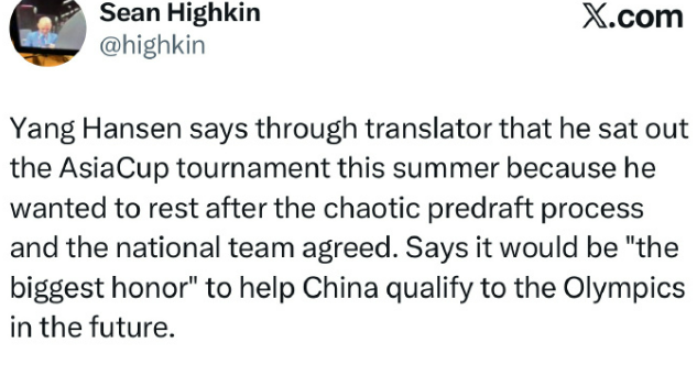 此前杨瀚森在开拓者新赛季媒体日接受采访时,表示:“未来若能帮助中国男篮重返奥运会,将会是他的最大荣誉。”