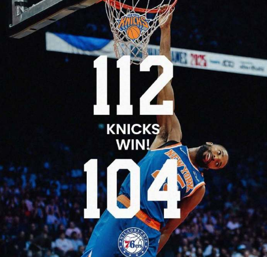 次节比赛,尼克斯继续扩大11分领先优势,巴洛中投追分,尼克斯连得5分扩大14分优势打停76人。76人连追4分,尼克斯连得5分扩大15分优势,76人一波9-2攻势追分,尼克斯连得4分。马克西三分命中,唐斯连得4分,76人冲击内线追分,布伦森连得3分,尼克斯单节28-24再赢4分,上半场比赛结束尼克斯扩大60-47领先76人13分优势。