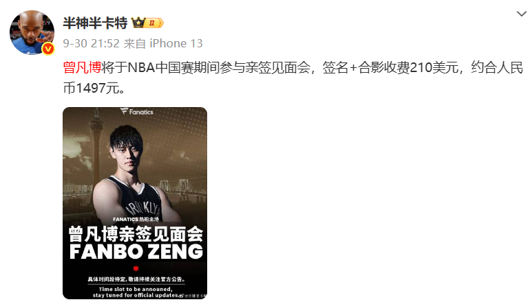 中国赛期间,篮网还筹备了曾凡博亲签见面会,竟然收费210美元,约合人民币1497元,被疯狂怒喷割韭菜,连带球员本人挨骂。