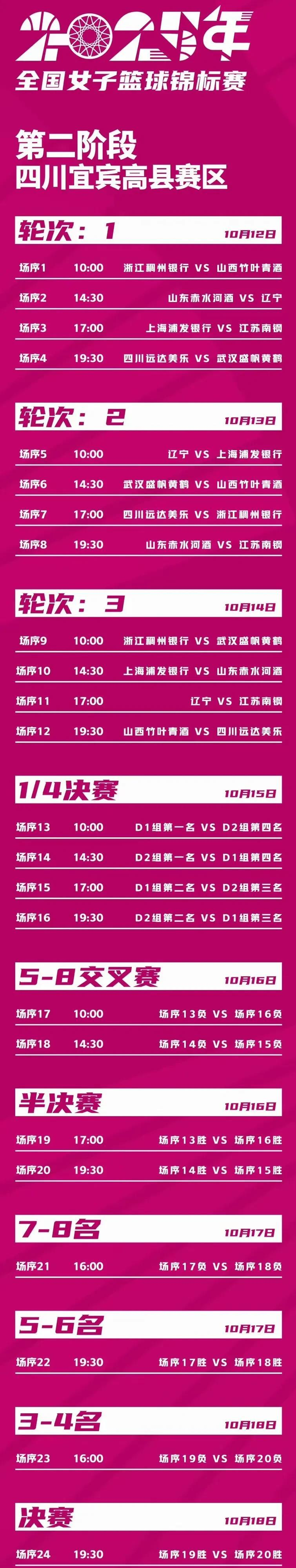 根据赛程安排,四川女篮将于10月12日至18日参加在四川宜宾高县赛区举行的第二阶段比赛。该赛区汇聚了包括江苏、山东、上海、辽宁、四川、浙江、武汉及山西在内的八支队伍。