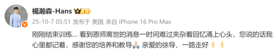 10月7日,杨瀚森发文痛悼恩师徐长锁:“刚刚结束训练…看到恩师离世的消息一时间难过夹杂着回忆涌上心头,您说的话我心里都记着,感谢您的培养和教导;亲爱的徐导,一路走好”