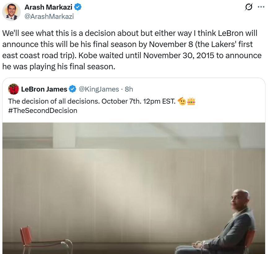 湖人随队记者Arash Markazi也公开表示,自己认为詹姆斯的“决定二”绝对不是宣布退役。