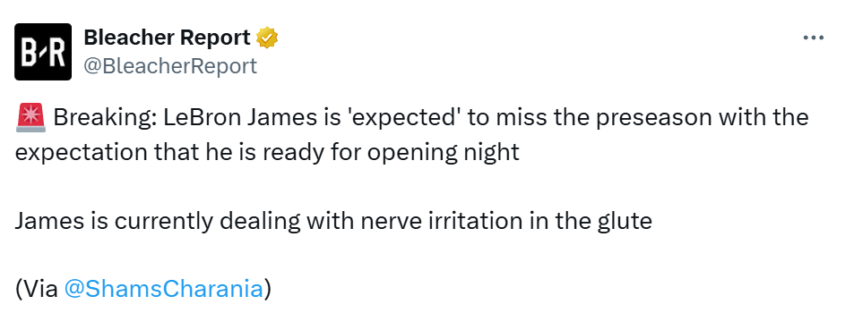 Shams说道:“我得知勒布朗-詹姆斯目前已开始增加训练强度,在球场上进行一些训练。但我也了解到,目前的预期仍是他可能会缺席整个季前赛。球队的目标是让他做好准备,迎接10月21日对阵金州勇士队的揭幕战。所以他在球场上的训练内容增多了,也开始参与更多篮球相关活动,但至于常规赛开始前他能否打一场比赛,还有待观察。”
