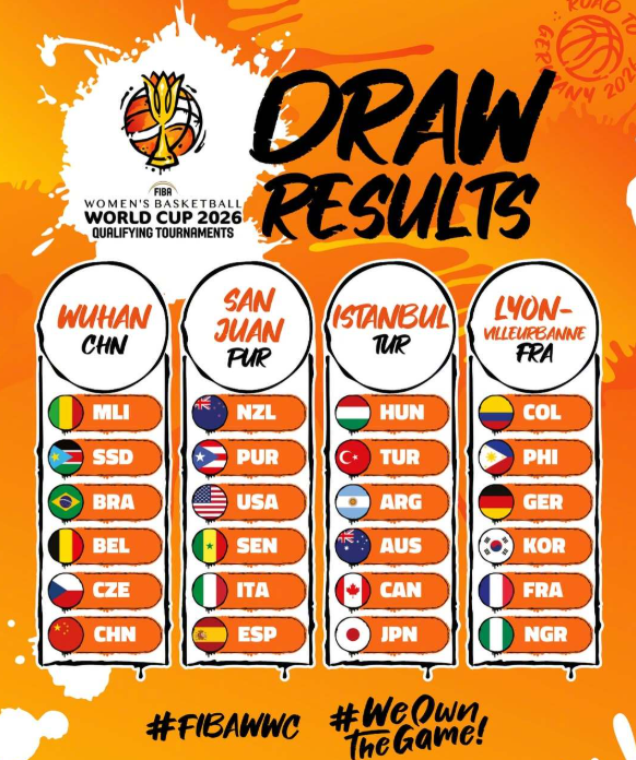 2026年女篮世界杯预选赛将于2026年3月11-17日举行,比赛由土耳其伊斯坦布尔、法国里昂(维勒班)、波多黎各圣胡安和中国武汉四座城市共同承办,每个赛区各有6支球队参赛。武汉举办的是A组的比赛。