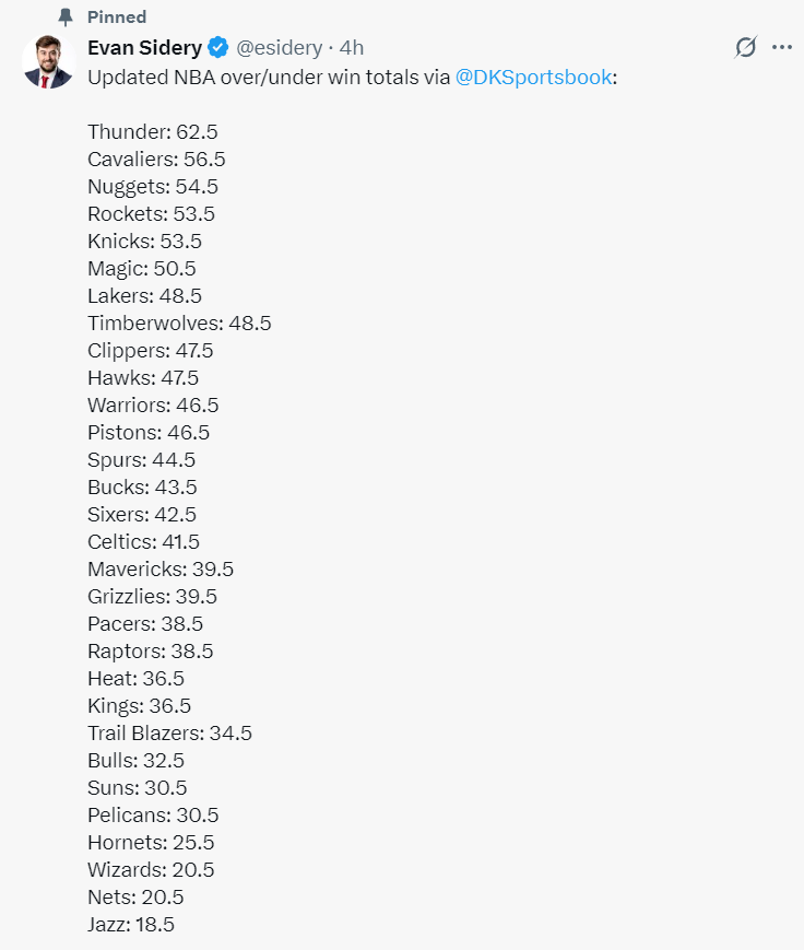 北京时间10月8日,美媒DKSportsbook预测了联盟30支球队的战绩情况: