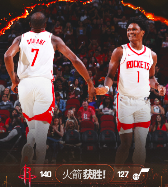 爆砍140分!火箭季前赛2连胜:杜兰特首秀20分,五号秀25分惊艳