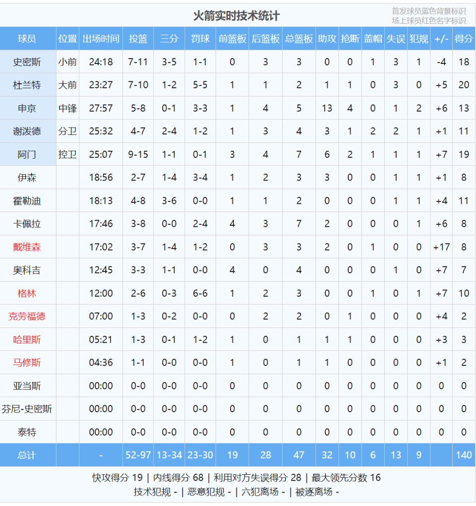 申京此役出战27分57秒,投篮8中5,三分1中0,罚球3中3,得到13分5篮板13助攻4抢断1失误,正负值+6。两场季前赛,申京合计16投10中,一共砍下32分10篮板19助攻(2失误)。经过今年夏天的男篮欧洲杯,申京真的进化了!