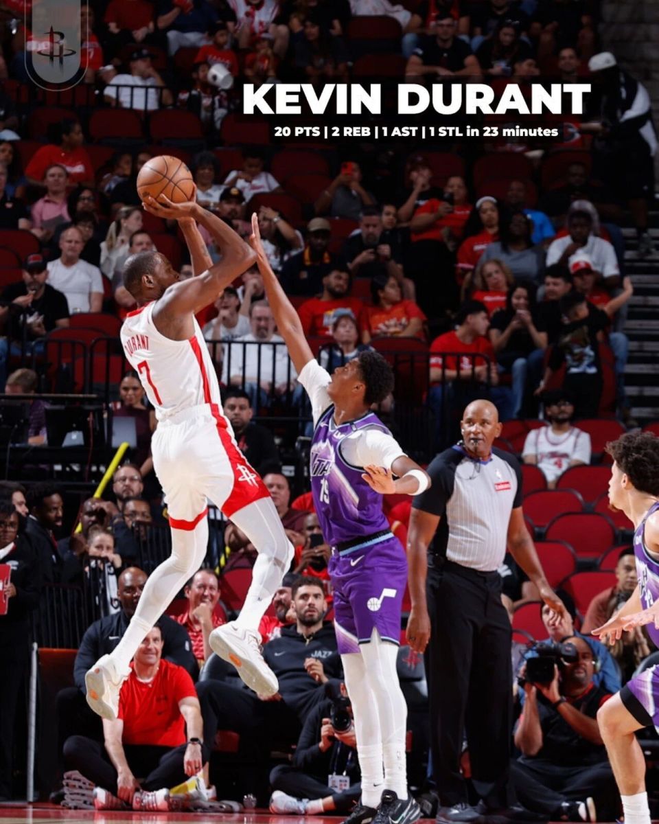 北京时间10月9日,NBA季前赛,火箭140-127战胜爵士。杜兰特上演火箭首秀:出战23分27秒,投篮10中7,三分2中1,罚球5中5,轻松砍下20分2篮板1助攻1抢断3失误,正负值+5。杜兰特前3投0中,之后7次出手全部命中!