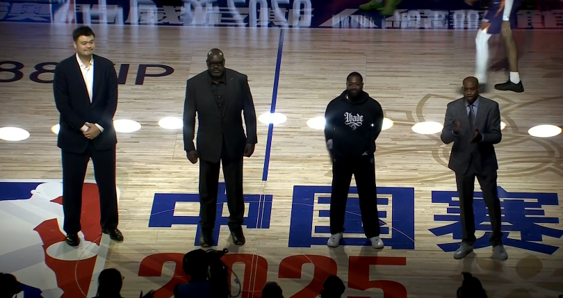 第二节暂停期间,姚明、奥尼尔、韦德和卡特一起以NBA传奇球星的身份亮相。
