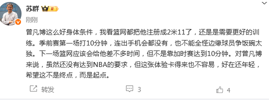 媒体人苏群发文点评:曾凡博这么好身体条件,我看篮网都把他注册成2米11了,还是需要更好的训练。季前赛第一场打10分钟,连出手机会都没有,也不能全怪边缘球员争饭碗太独。下一场篮网应该会给他差不多时间,但不是靠加时赛达到10分钟。对曾凡博来说,虽然还没有达到NBA的要求,但这张体验卡得来也不容易,好在还年轻,希望这不是终点,而是起点。