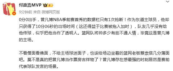 媒体人付政浩发文点评说道:0分0出手,曾凡博NBA季前赛首秀的数据栏只有1次抢断!作为东道主球员,他却只获得了10分06秒的出场时间(这还得益于比赛被拖入加时),队友几乎没有给他传球,似乎把他当作了透明人。篮网队将帅多少有些不通人情,毕竟这是曾凡博的主场。
