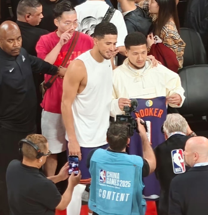 赛后布克与他的模仿者“中国布克”合影留念,并赠送了自己亲笔签名的球衣。“中国布克”因为长相和打法酷似布克,在社交媒体上走红。