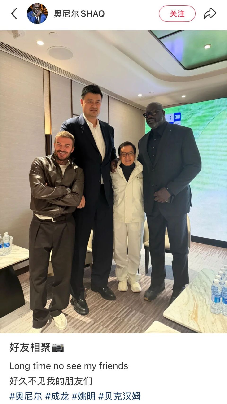 10月11日,成龙晒出多张与贝克汉姆、姚明、奥尼尔的合影,并配文:哈哈,好久不见!奥尼尔也在其社交媒体上发文:好友相聚。Long time no see my friends。