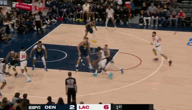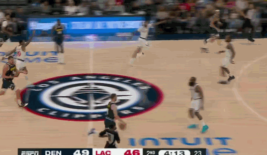 易边再战,快船用布朗和巴图姆换掉莱昂纳德和科林斯,掘金继续使用首发。穆雷上篮得分,约翰逊、布劳恩三分命中,掘金一波8-0反超。科林斯三分命中,琼斯打成2+1,快船追平掘金。瓦兰扣篮,保罗换下哈登,戈登中投命中。第三节打到一半,双方所有主力都被换下。布朗连续罚球得分,瓦兰勾手命中,三节战罢,掘金76-75领先快船。
