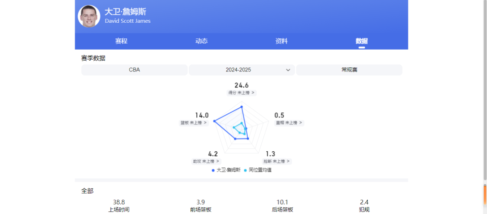 大卫詹姆斯完全是王俊杰的顶配版本,两人风格相似,但大卫的身体素质爆发力更好。他在天津男篮带着一群边缘球员,仍能打出场均24.6分14篮板4.2助攻的数据,这就是硬实力和职业态度的体现。