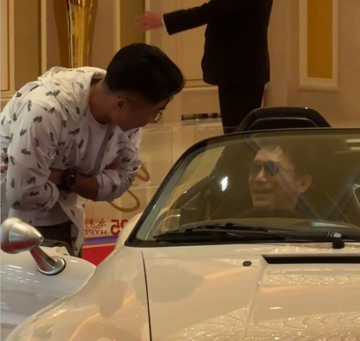 梁朝伟紧跟在老婆身后,刚一进大厅就被那辆豪车给吸引住了,坐上去之后还试了一下,他脸上的笑容说明他挺喜欢这辆车的。