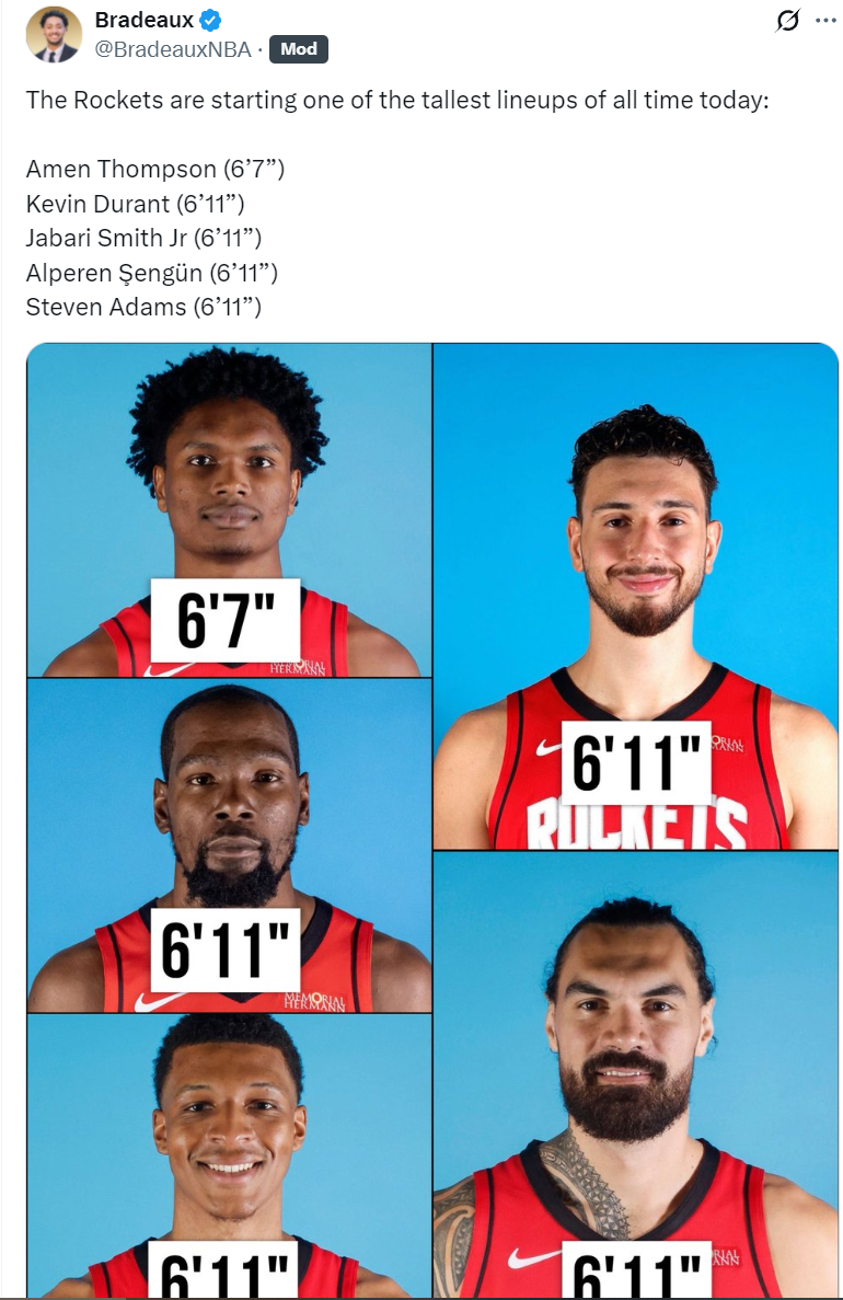 这套先发阵容阿门6尺7(2.01米)、小贾巴里6尺10(2.08米)、杜兰特6尺11(2.11米)、申京6尺11(2.11米)、亚当斯6尺11(2.11米),先发平均身高2.084米。