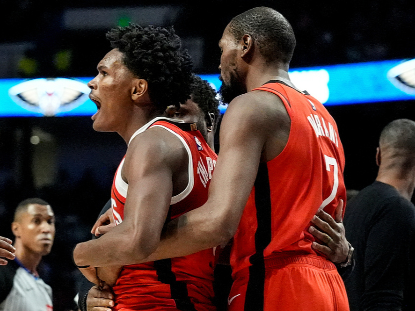 杜兰特轻舒长臂,一记精准中投应声入网,火箭第三节的攻势已如潮水般不可阻挡。