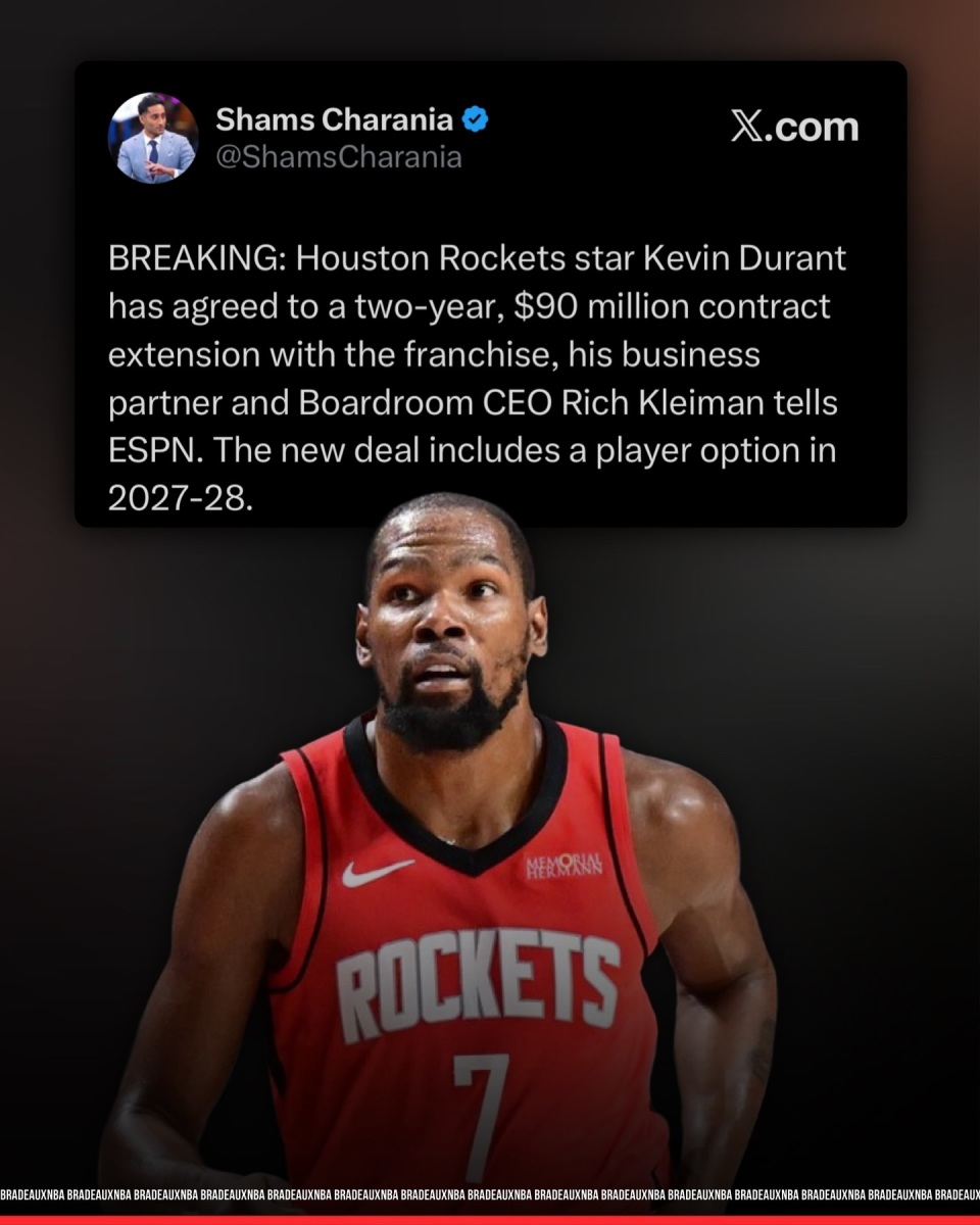 根据Shams的报道称,杜兰特2年9000万美元提前续约火箭,其中第二年(2027-28赛季)为球员选项。需要说明的是,杜兰特最高可续2年1.2亿美元,目前的合同他降薪3000万美元,为保持火箭队薪资空间灵活性,便于双方长期合作。