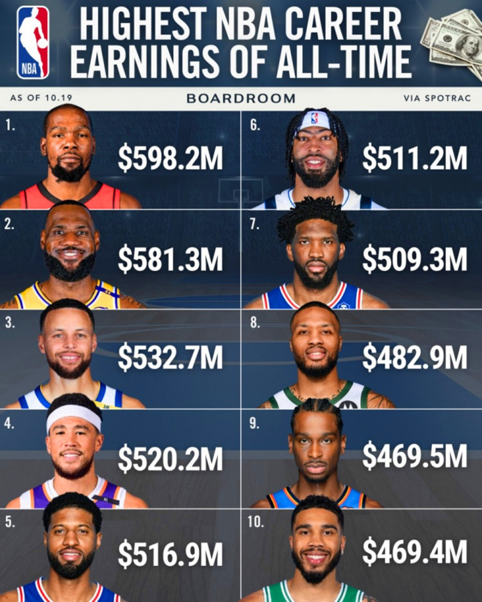 在常规赛到来前,多支球队完成千万级别续约,为此,美媒Boardroom根据薪资网站SpotracNBA数据统计公布出历史总薪资TOP10名单,其中杜兰特2年9000万续约火箭队超詹姆斯登顶,乔治5.16亿高居第5。