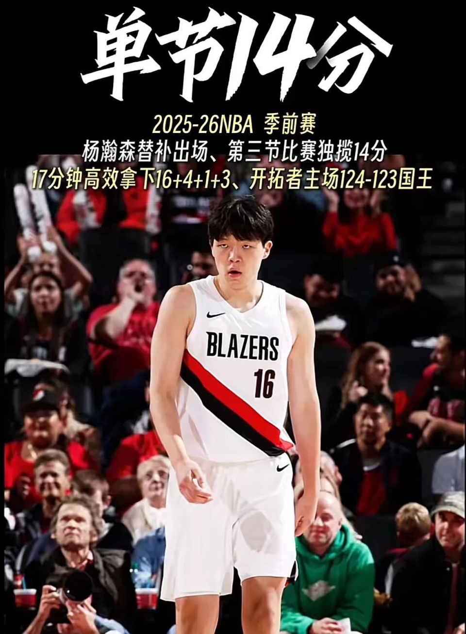 第二场对阵萨克拉门托国王队的比赛成为杨瀚森状态的转折点。上半场他仅得2分、2篮板,但下半场,特别是在第三节,他5投全中,其中包括两记三分球,单节独得14分。全场他出战17分钟,以8投5中的高效命中率贡献16分、4篮板、1助攻和3次盖帽。比卢普斯教练对此表示赞赏,认为杨瀚森已逐步找到比赛节奏。