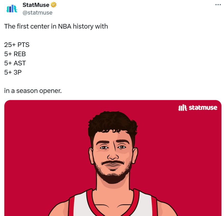 凭借这样的表现,申京成为NBA历史上首位在揭幕战至少得到25分5板5助并命中5记三分的中锋,也是火箭队队史首位在揭幕战至少可以得到39分11篮板7助攻的球员。