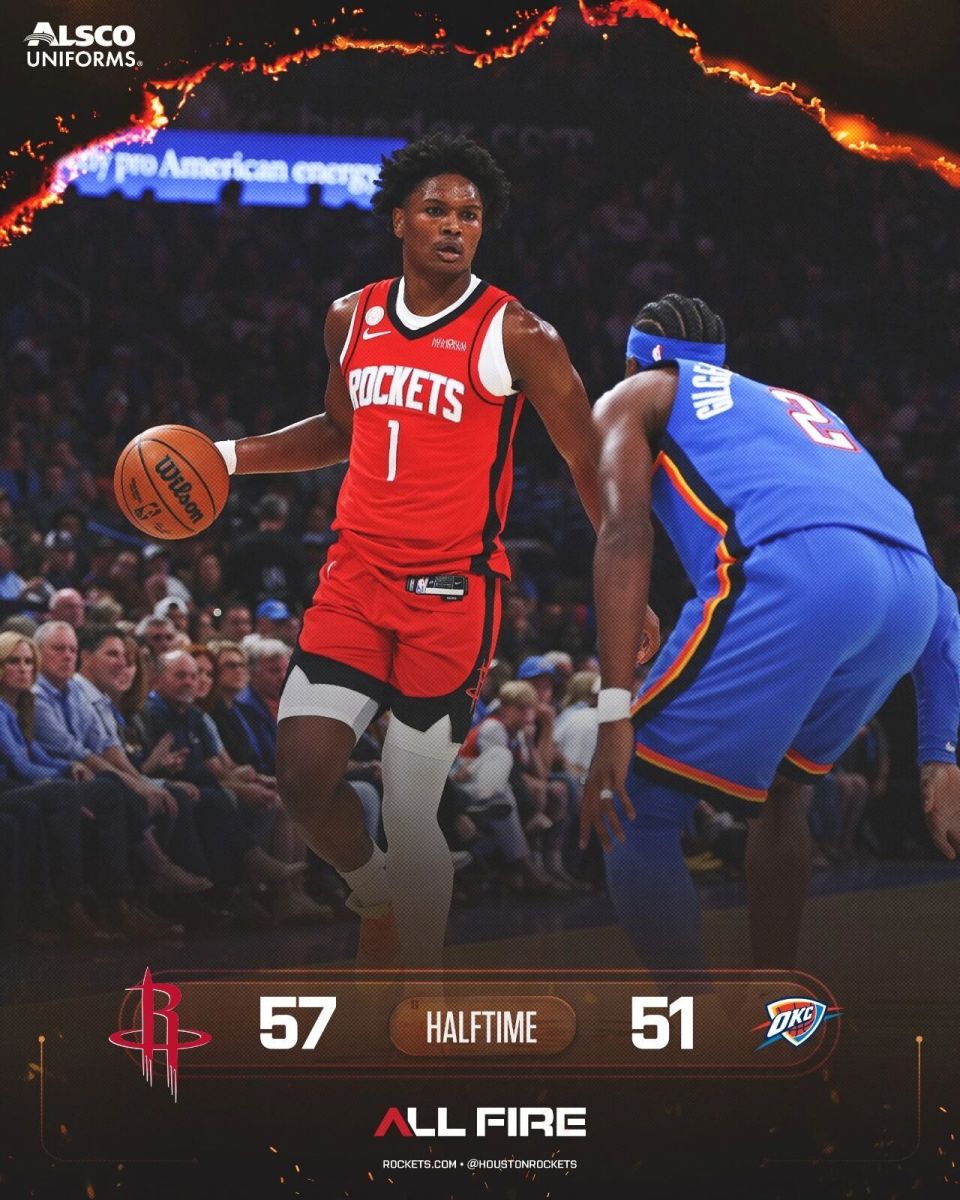 雷霆名宿伊巴卡现场观战,如今已是型男。上半场最后0.7秒,阿杰伊-米切尔帮雷霆打成3+1!半场战罢,火箭57-51领先雷霆。霍姆格伦9中7拿到18分4板;杜兰特11中6拿到14分5板。火箭三分19中7,雷霆20中5,篮板球火箭21-17。