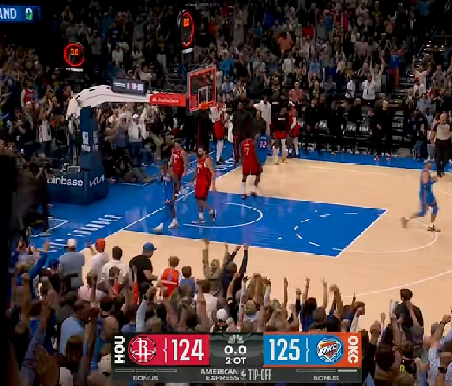 第二个加时赛最后时刻,亚历山大造成杜兰特致命犯规用两记罚球绝杀比赛,全场打完雷霆125-124险胜火箭。